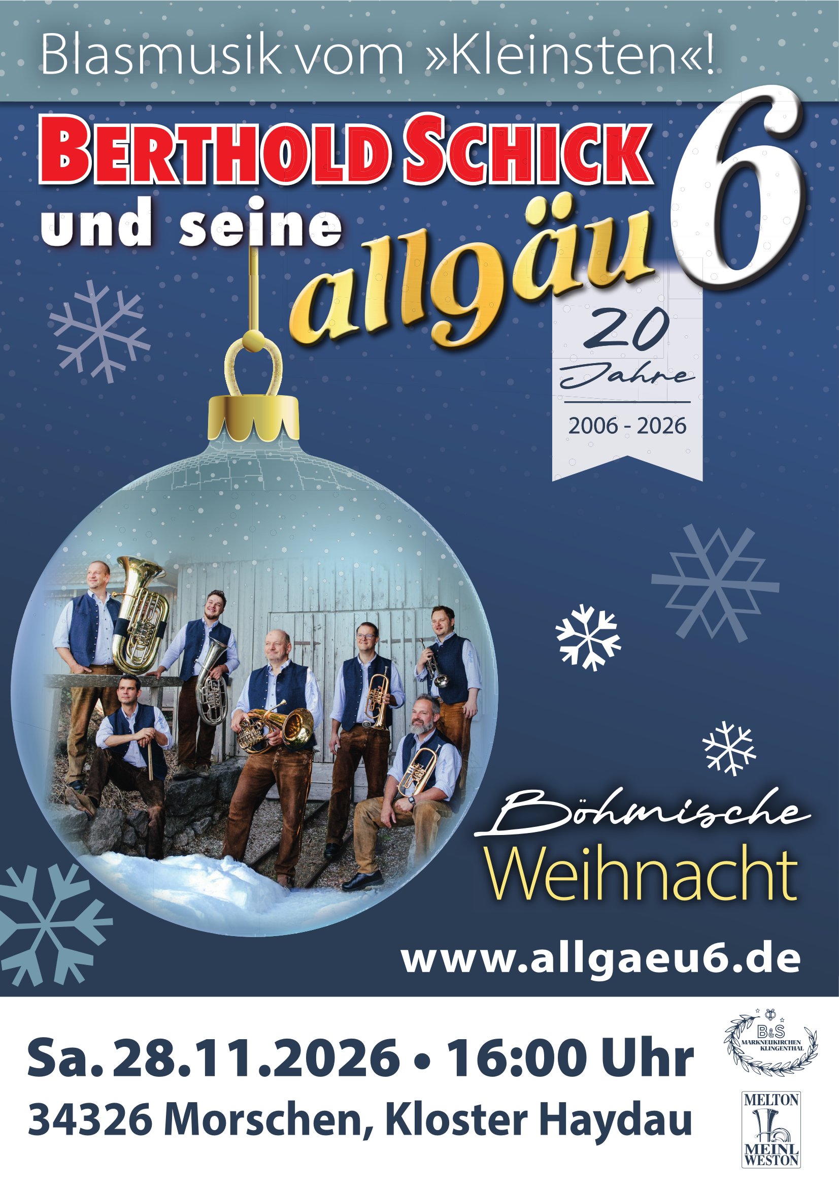 Berthold Schick und seine Allgäu6 zählen zweifelsohne zu den gefragtesten Ensembles im musikalischen Bereich der Böhmischen Blasmusik. Bei den großen Blasmusikfestivals wie dem Woodstock der Blasmusik, Winterwoodstock, Brasswiesn, Blechlawine und vielen weiteren ist diese Top-Formation immer gern gesehener Gast und sorgt für wahre Begeisterungsstürme. Aber auch in den Konzerthallen und Festzelten im In-und Ausland weiß Berthold Schick und seine 6 Profi-Musiker immer wieder mit der Vielfalt seiner musikalischen Darbietungen einen großen Bogen zu spannen. In der Haydau gastiert diese Formation zum dritten Mal in der Orangerie.