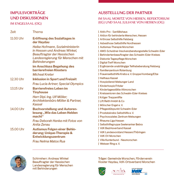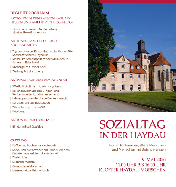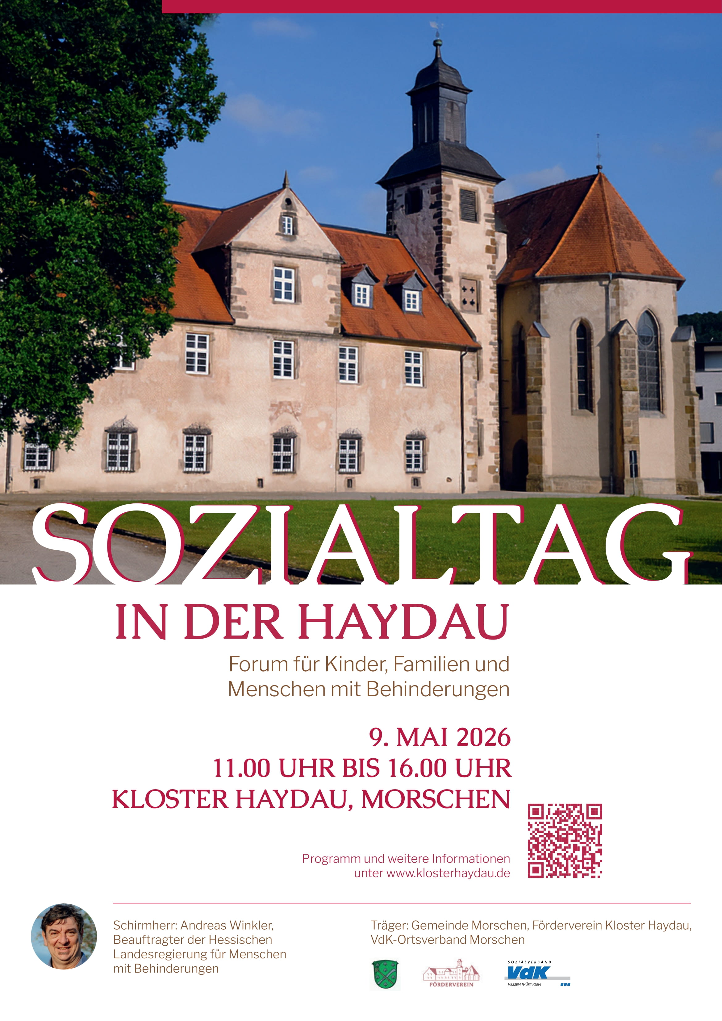 Nach einem erfolgreichen Sozialtag im Vorjahr widmet sich der zweite Sozialtag dem Themenkomplex Kinder und Jugendliche in den Familien, Kindergärten und Beruf, sowie Menschen mit Behinderungen. Ein umfangreiches Programm wird für diese Fachthemen, sowie ein kulturelles Begleitprogramm wird derzeit noch erarbeitet. Einzelheiten des Programmablaufes, sowie die beteiligten Verbände, Vereine und Firmen werden an dieser Stelle rechtzeitig bekannt gegeben. Schirmherr des Sozialtages in der Haydau 2026 ist der Beauftragte des Hessischen Landesregierung für Menschen mit Behinderungen, Andreas Winkler. Die Gemeinde Morschen, der Förderverein Kloster Haydau und der VdK Ortsverband Morschen tragen diese Veranstaltung.